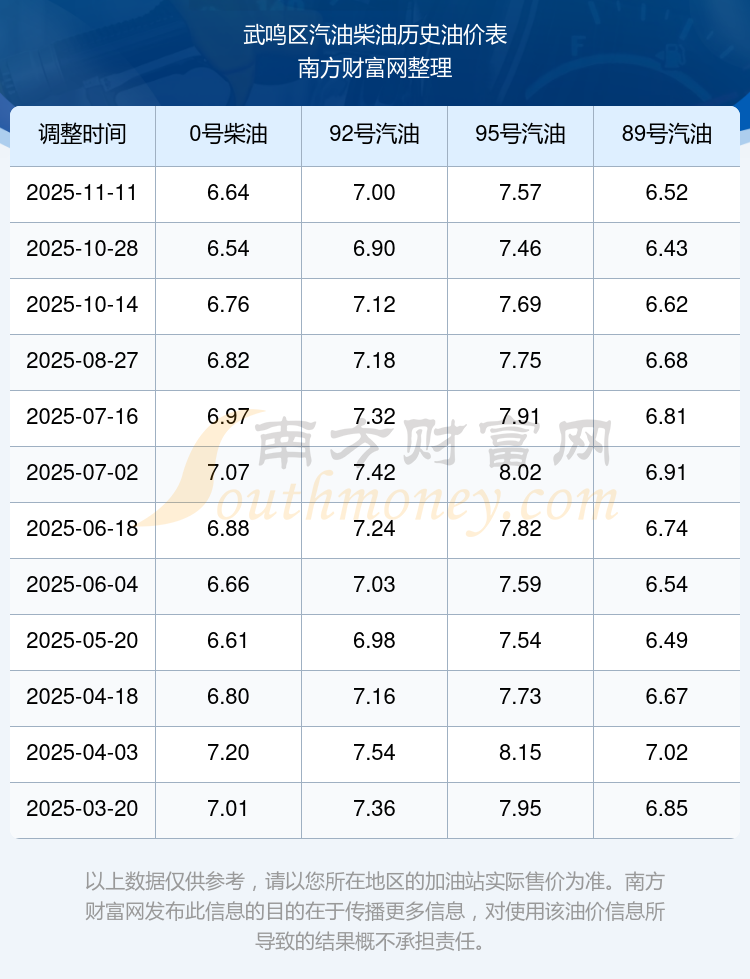 11月22日武鸣区汽油柴油每升价格(11月11日调整后的价格):92号汽油为7元,增了0.1元,增幅达1.45%;95号汽油为7.57元,增了0.11元,增幅达1.48%;89号汽油为6.52元,增了0.09元,增幅达1.4%;0号柴油为6.64元,增了0.1元,增幅达1.53%。