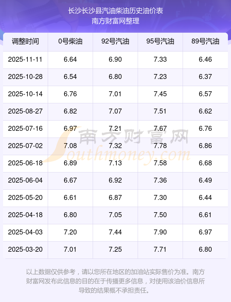 2025年长沙长沙县汽油价格一览表