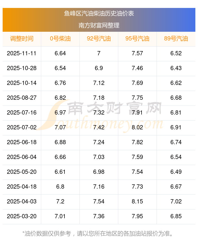 鱼峰区汽油、柴油11月22日价格多少钱一升?具体为:0号柴油为6.64元,上调了0.1元;95号汽油为7.57元;92号汽油为7元;89号汽油为6.52元,调整时间为11月11日。