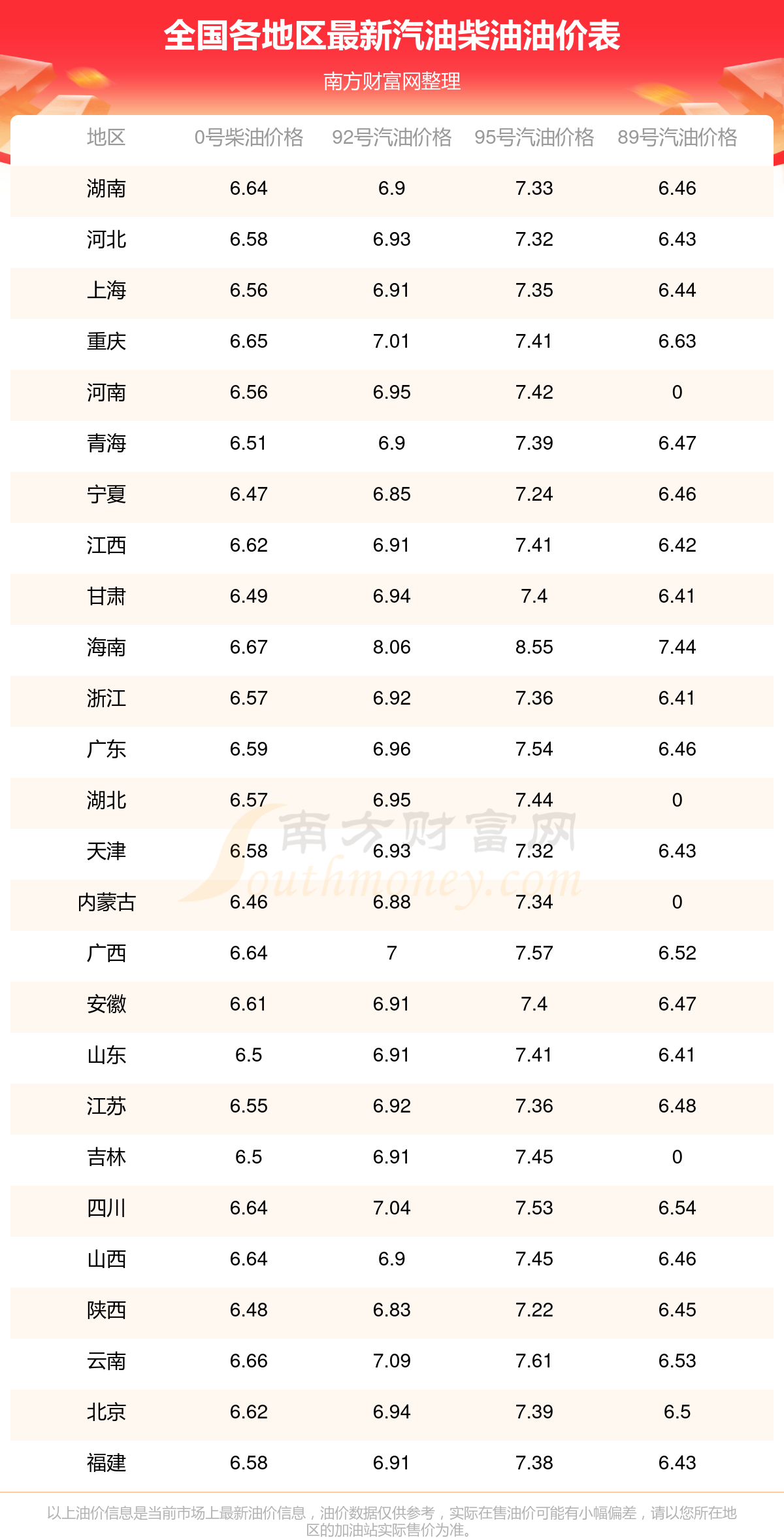 全国0号柴油最新平均价格为:7元每升,其中,最低为内蒙古,价格为6.46元/升,最高为海南,价格为6.67元/升。