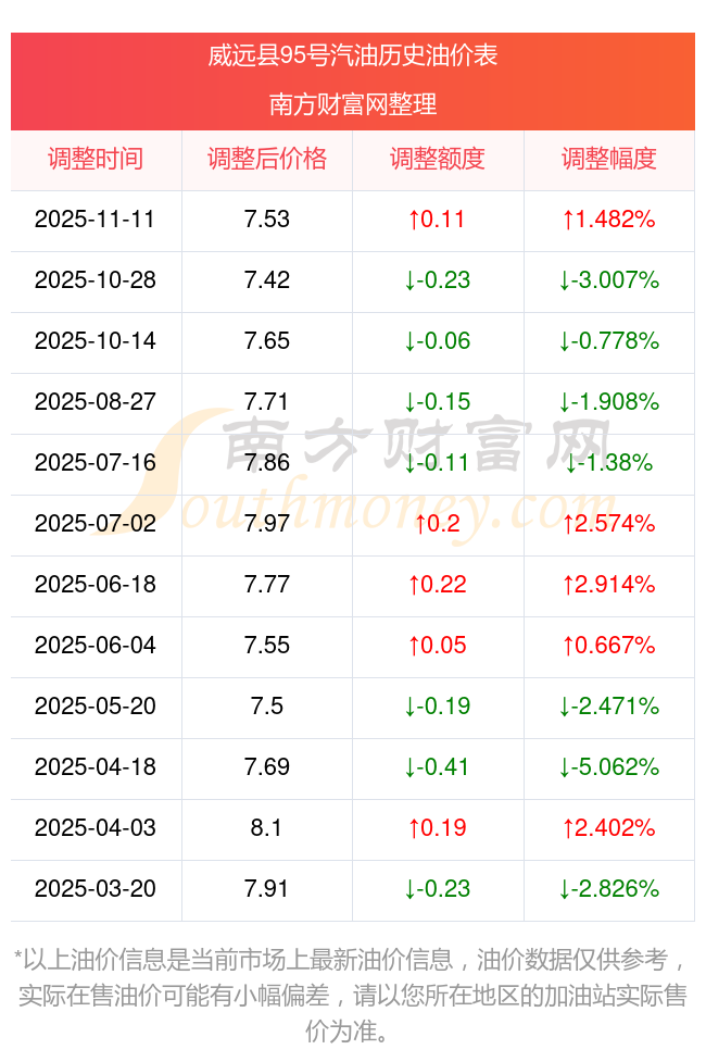 威远县95号汽油历史油价表