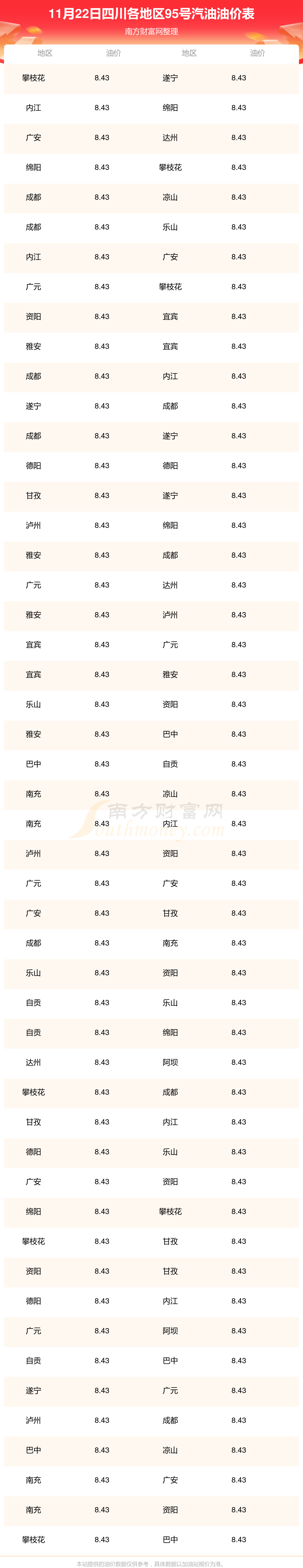 11月22日,四川95号汽油的价格是7.53元每升,本次的调整时间为11月11日,对比上次的调整增了0.11元,增1.482%,11月24日24时为下一轮油价调整时间,还有2.61天。