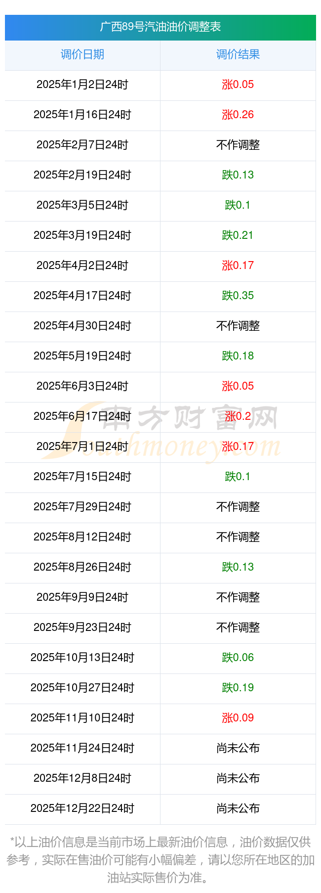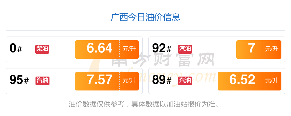 河池汽油、柴油11月22日每升的价格为(油价调整时间是11月11日):92号汽油7元;95号汽油7.57元;89号汽油6.52元;0号柴油6.64元。河池下一轮油价调整时间11月24日24时,距离现在还有2.61天。