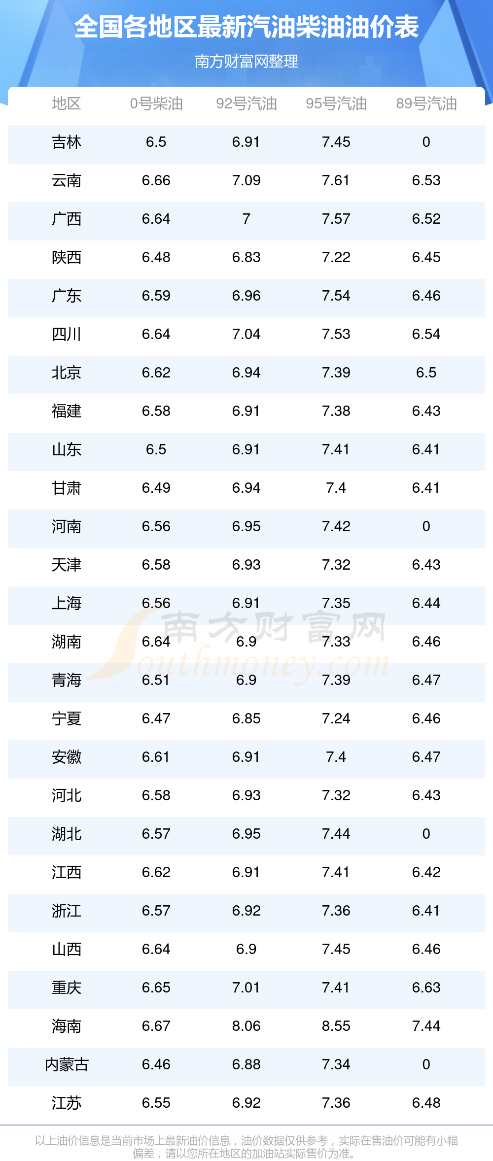 油价最新调整时间为11月11日 ,全国92号汽油最新平均价格为:7元每升,其中,最高为海南,价格为8.06元/升,最低为陕西,价格为6.83元/升。全国95号汽油最新平均价格为:7元每升,其中,最高为海南,价格为8.55元/升,最低为陕西,价格为7.22元/升。全国0号柴油最新平均价格为:7元每升,其中,最高为海南,价格为6.67元/升,最低为内蒙古,价格为6.46元/升。全国89号汽油最新平均价格为:7元每升,其中,最高为海南,价格为7.44元/升,最低为浙江,价格为6.41元/升。,下一轮油价调整时间11月24日24时,距离现在还有2.58天。