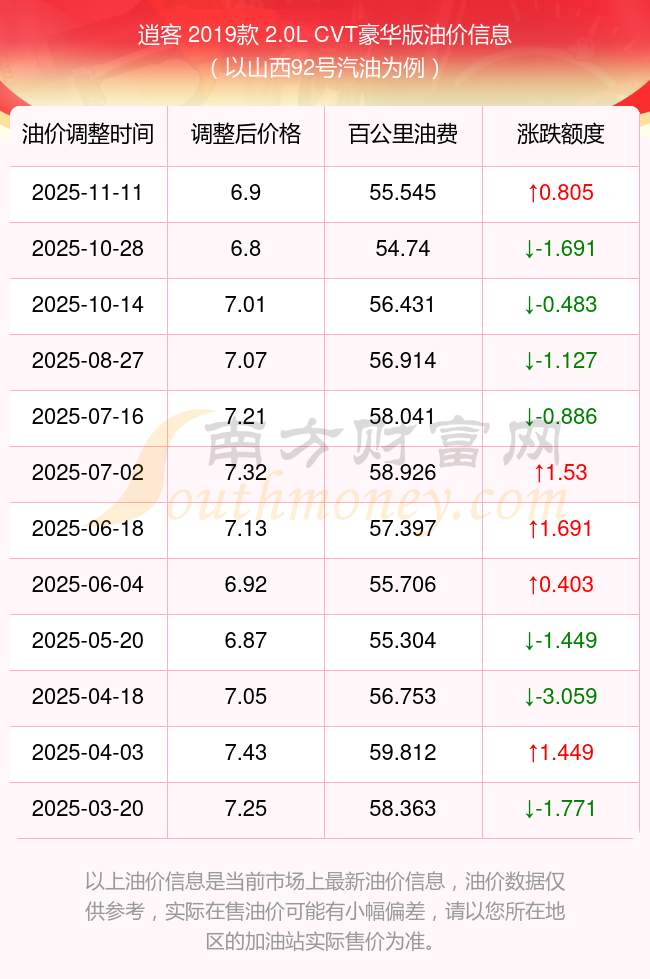 按照11月11日92号汽油最新调整价格6.9元/升来计算(以山西为例),该车型百公里平均油费为55.545元,按照上一轮10月28日调整价格6.8元/升来计算,百公里平均油费为54.74元,对比上一轮多花0.805元,下一轮油价调整时间为11月24日24时。