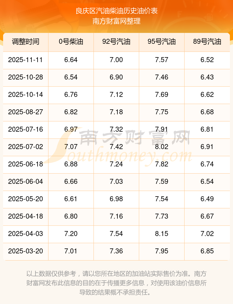 良庆区汽油、柴油11月22日每升的价格(油价调整时间11月11日):92号汽油7元;95号汽油7.57元;89号汽油6.52元;0号柴油6.64元。