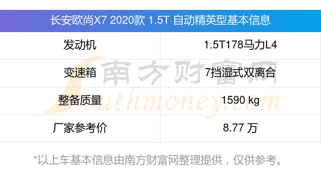 长安欧尚X7 2020款 1.5T 自动精英型动力上配备的是一台1.5T178马力L4涡轮增压发动机,匹配的是7挡湿式双离合自动档变速箱,燃料形式为汽油,常规整备质量1590kg,厂家参考价8.77万元。