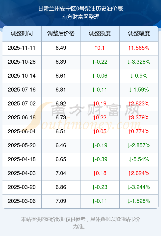 甘肃兰州安宁区0号柴油历史油价表
