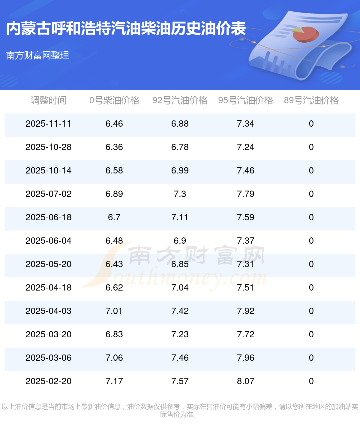 内蒙古呼和浩特今日油价查询_内蒙古呼和浩特92_95_0号汽油柴油价格最新价(2025-11-22)