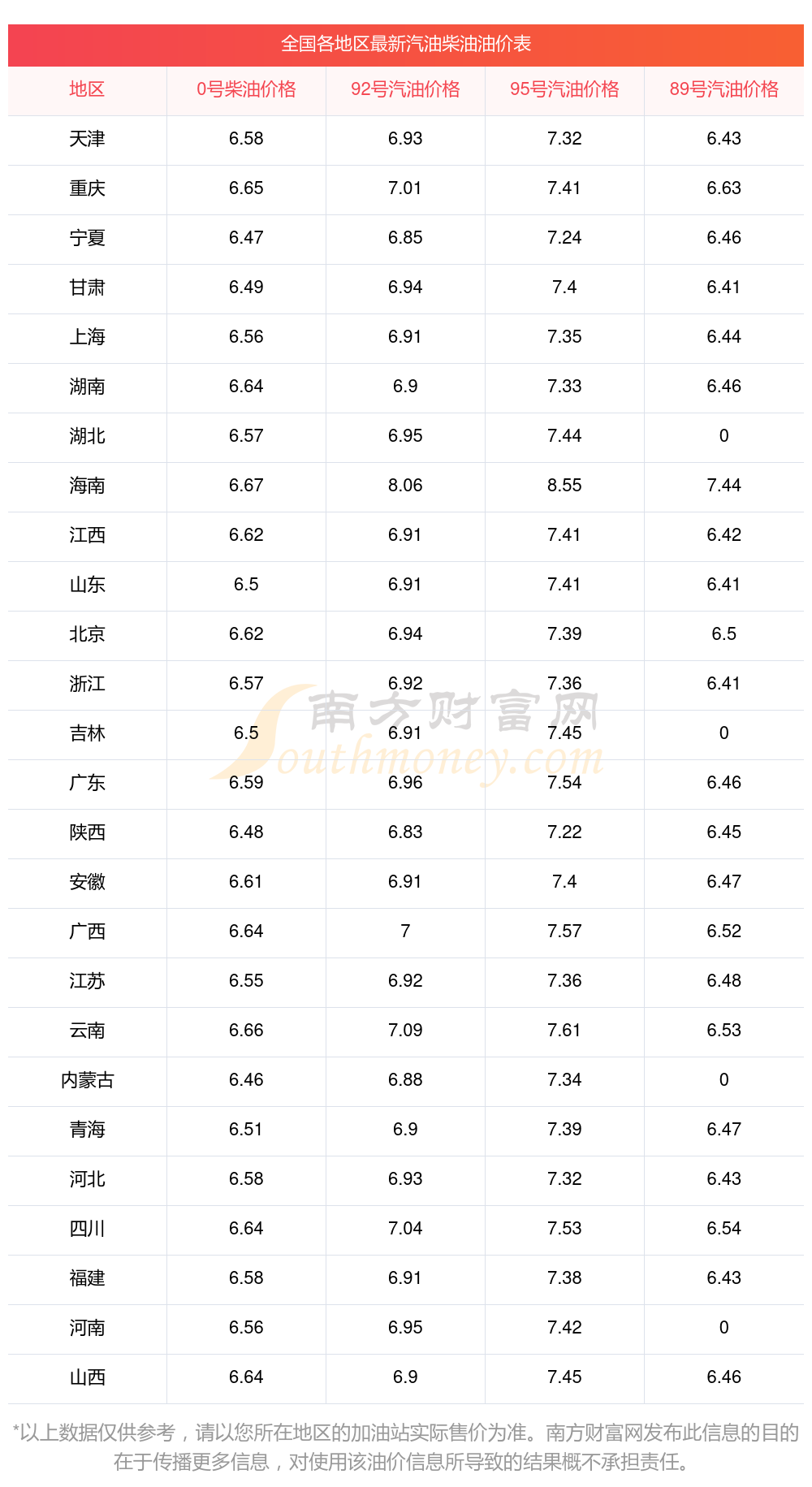 以上油价信息是当前市场上最新油价信息,油价数据仅供参考,实际在售油价可能有小幅偏差,请以您所在地区的加油站实际售价为准。