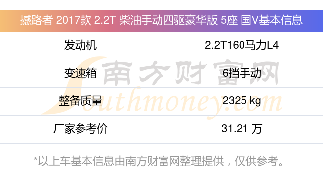 在动力上,撼路者 2017款 2.2T 柴油手动四驱豪华版 5座 国V配备的是一台2.2T160马力L4涡轮增压发动机,匹配的是6挡手动挡变速箱,燃料形式为柴油,常规整备质量2325kg,厂家参考价31.21万元。