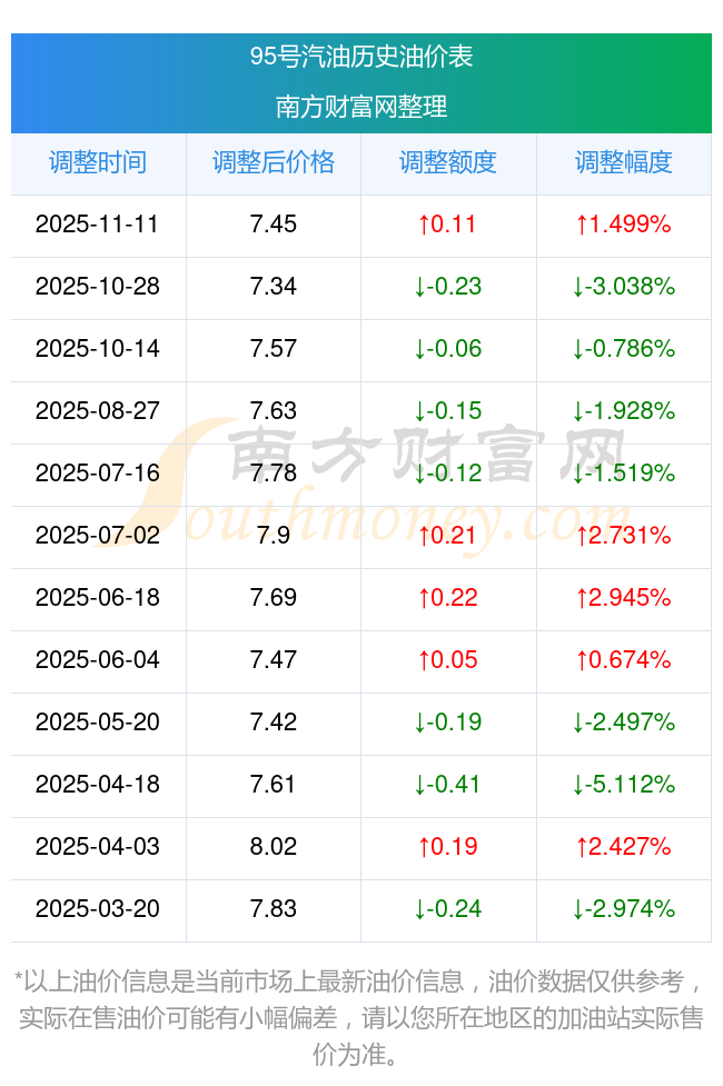 油价调整最新消息:下一轮油价调整时间11月24日24时。11月22日,山西汽油、柴油价格的调整时间为11月11日。每升最新价格为:92号汽油为6.9元,增了0.1元;95号汽油为7.45元,增了0.11元;89号汽油为6.46元,增了0.1;0号柴油为6.64元,增了0.1元。