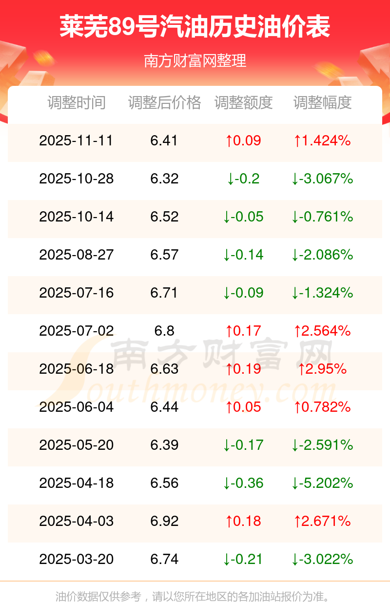 11月22日莱芜89号汽油的价格为6.41元/升,这是11月11日调整后的价格,对比上轮调整涨了0.09元,涨1.424%。