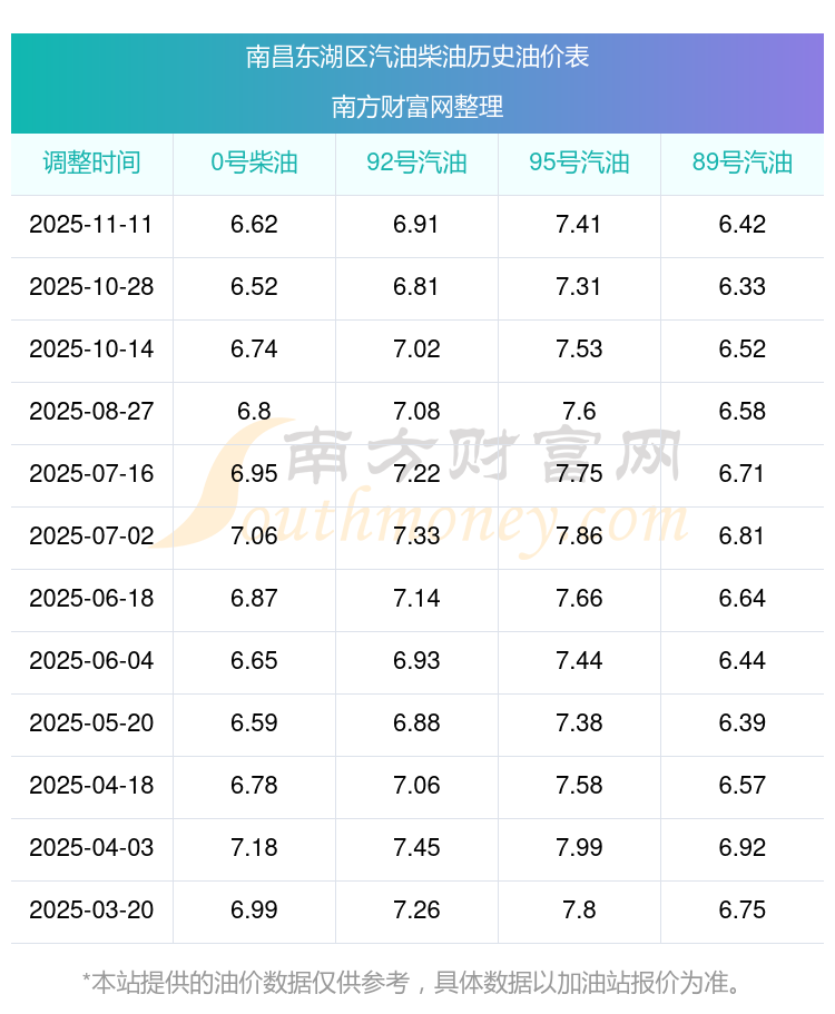 南昌东湖区11月22日汽油价格一览:92号汽油6.91元;95号汽油7.41元;89号汽油6.42元;0号柴油6.62元(该价格为11月11日调整后的价格)。