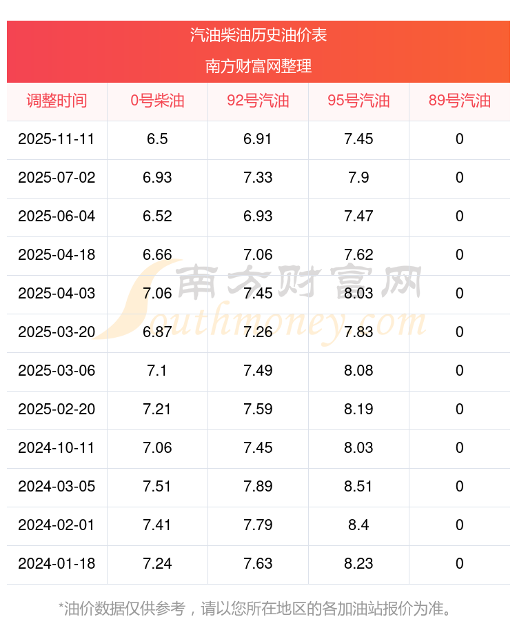 吉林通化95号汽油11月22日的价格为11月11日调整后的价格,具体为7.45元/升,相对上次调整增了0.11元。下一轮油价调整时间11月24日24时,距离现在还有2.55天。