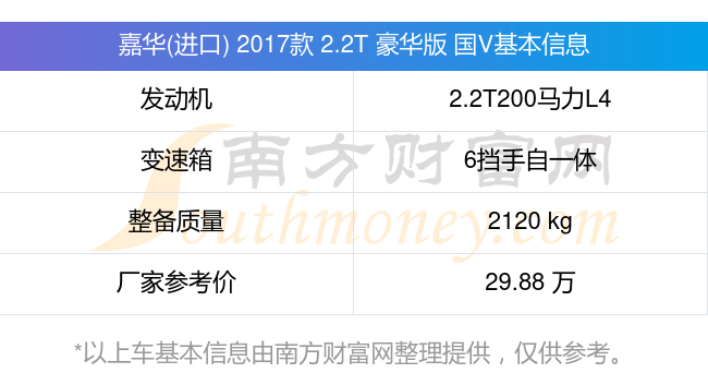 在动力方面,嘉华(进口) 2017款 2.2T 豪华版 国V搭载的是一台2.2T200马力L4涡轮增压发动机,匹配6挡手自一体自动档变速箱,燃料形式为柴油,常规整备质量2120kg,厂家参考价29.88万元。