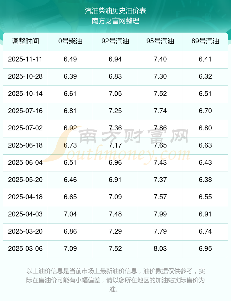 嘉峪关95号汽油11月22日最新价格为11月11日油价调整后的价格,具体为7.4元/升,相对上次调整时间10月28日的油价7.3元每升,共上调了0.1元,上调1.37%。下一轮油价调整时间11月24日24时,距离现在还有2.54天。