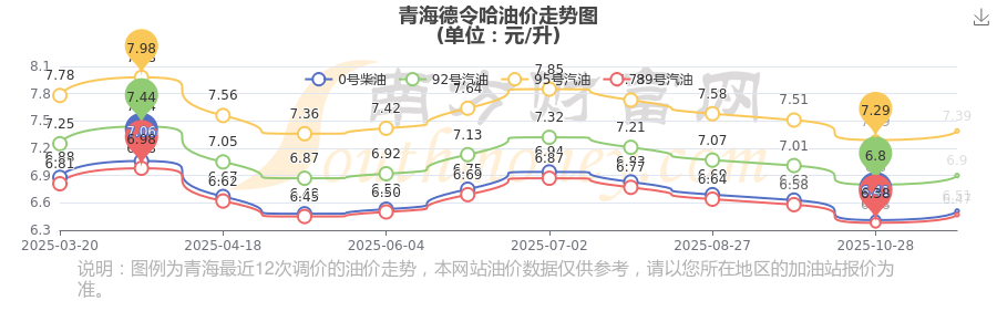 11月22日青海德令哈汽油柴最新油价是多少?具体每升为:11月11日调整后,92号汽油为6.9元,上调了0.1元,上调幅达1.47%;95号汽油为7.39元,上调了0.1元,上调幅达1.37%;89号汽油为6.47元,上调了0.09元,上调幅达1.41%;0号柴油为6.51元,上调了0.1元,上调幅达1.56%。