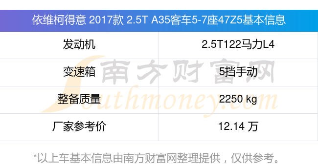 在动力上,依维柯得意 2017款 2.5T A35客车5-7座47Z5配备的是一台2.5T122马力L4涡轮增压发动机,匹配的是5挡手动挡变速箱,燃料形式为柴油,常规整备质量2250kg,厂家参考价12.14万元。