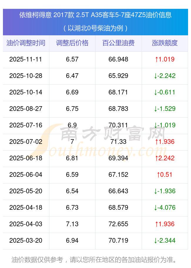 根据11月11日0号柴油最新调整价格6.57元/升来计算(以湖北为例),该车型每百公里的平均油费是66.948元,上一轮10月28日调整价格6.47元每升来计算,每百公里的平均油费是65.929元,对比上一轮多花1.019元,下一轮的油价调整时间是11月24日24时。