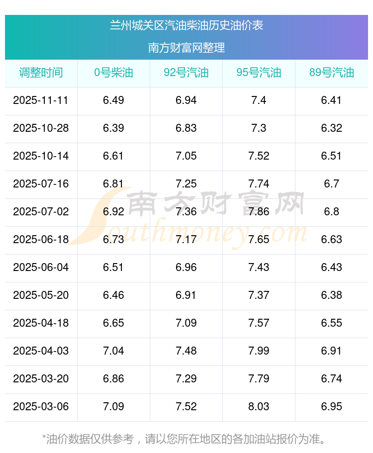 11月22日,兰州城关区汽油、柴油每升最新价格为:92号汽油为6.94元,增了0.11元;95号汽油为7.4元,增了0.1元;89号汽油为6.41元,增了0.09元;0号柴油为6.49元,增了0.1元,调整时间为11月11日。