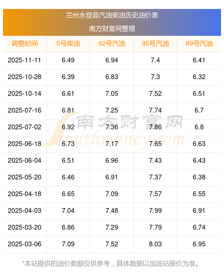 兰州永登县汽油、柴油11月22日每升的价格具体是(11月11日调整后的价格):92号汽油6.94元;95号汽油7.4元;89号汽油6.41元;0号柴油6.49元。