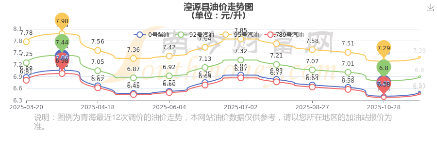 湟源县汽油、柴油11月22日每升的价格为11月11日调整后的价格,具体油价为:92号汽油6.9元;95号汽油7.39元;89号汽油6.47元;0号柴油6.51元。