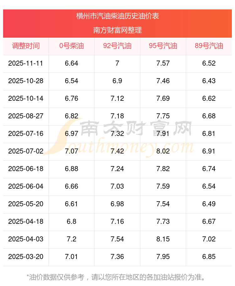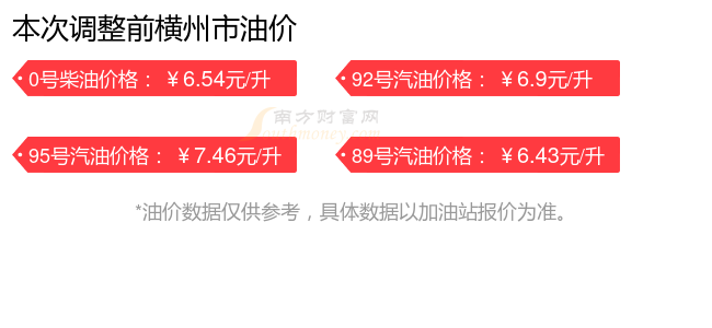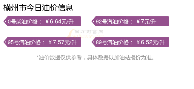11月22日的横州市汽油、柴油每升最新价格(调整时间为11月11日):92号汽油为7元,涨了0.1元,涨幅达1.45%;95号汽油为7.57元,涨了0.11元,涨幅达1.48%;89号汽油为6.52元,涨了0.09元,涨幅达1.4%;0号柴油为6.64元,涨了0.1元,涨幅达1.53%。