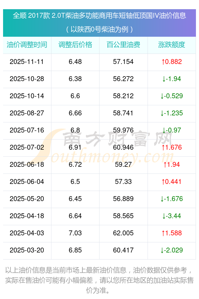 根据11月11日0号柴油最新调整价格6.48元/升来计算(以陕西为例),该车型每百公里的平均油费是57.154元,上一轮10月28日调整价格6.38元每升来计算,每百公里的平均油费是56.272元,对比上一轮多花0.882元,下一轮的油价调整时间是11月24日24时。