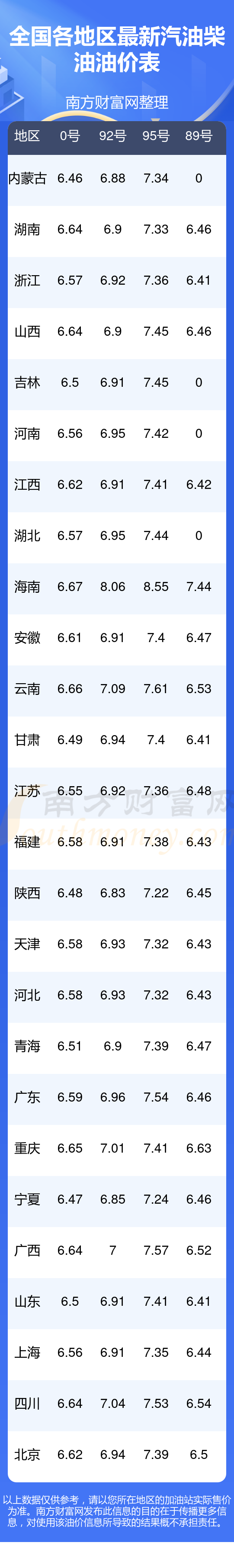 全国各地区最新油价表