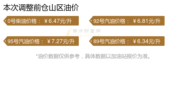 11月22日仓山区汽油、柴油每升的价格详情如下:92号汽油6.91元,上涨了0.1元;95号汽油7.38元,上涨了0.11元;89号汽油6.43元,上涨了0.09元;0号柴油6.58元,上涨了0.11元,本次油价的调整时间为11月11日。