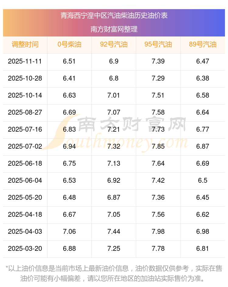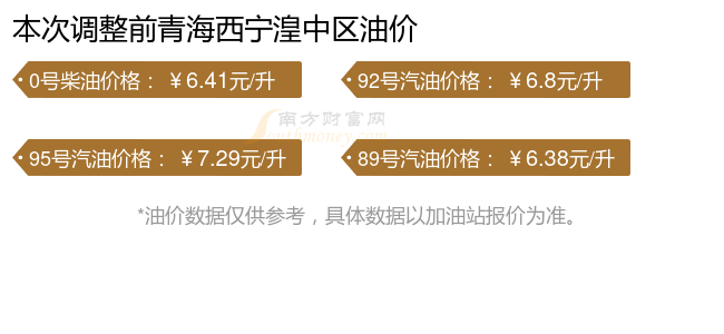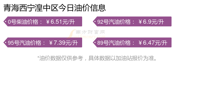 青海西宁湟中区11月22日汽油价格一览:92号汽油6.9元;95号汽油7.39元;89号汽油6.47元;0号柴油6.51元(该价格为11月11日调整后的价格)。