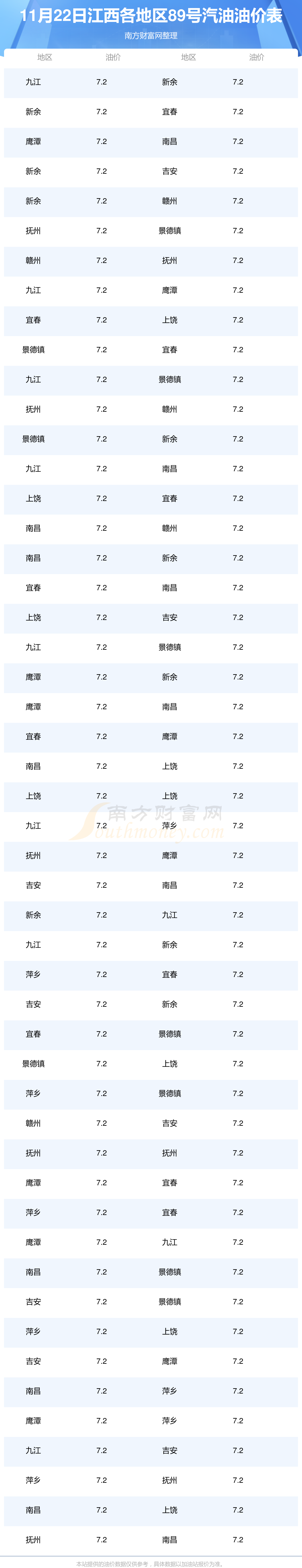 江西各地区最新89号汽油油价表