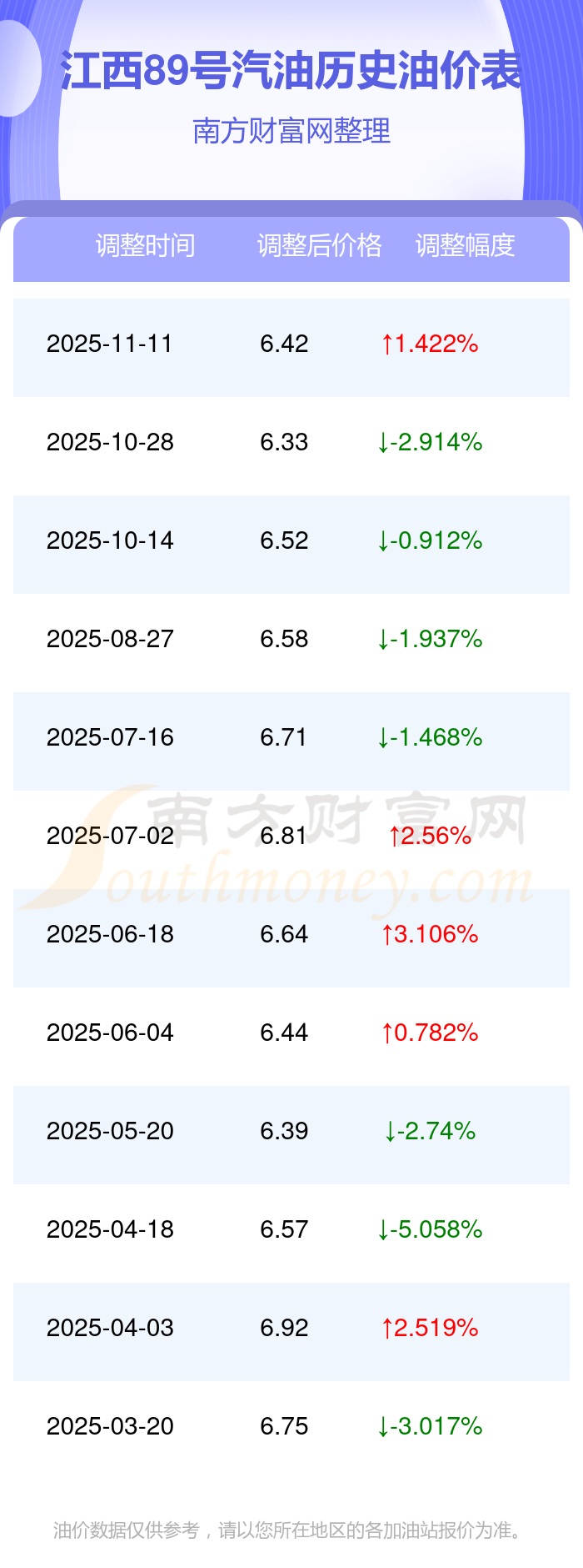11月22日,江西89号汽油价格为6.42元/升,本轮调整时间为11月11日,相对上次调整后10月28日的油价6.33元每升,增了0.09元,增幅达1.422%。