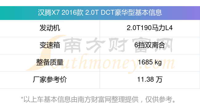 在动力上,汉腾X7 2016款 2.0T DCT豪华型配备的是一台2.0T190马力L4涡轮增压发动机,匹配的是6挡双离合自动档变速箱,燃料形式为汽油,常规整备质量1685kg,厂家参考价11.38万元。