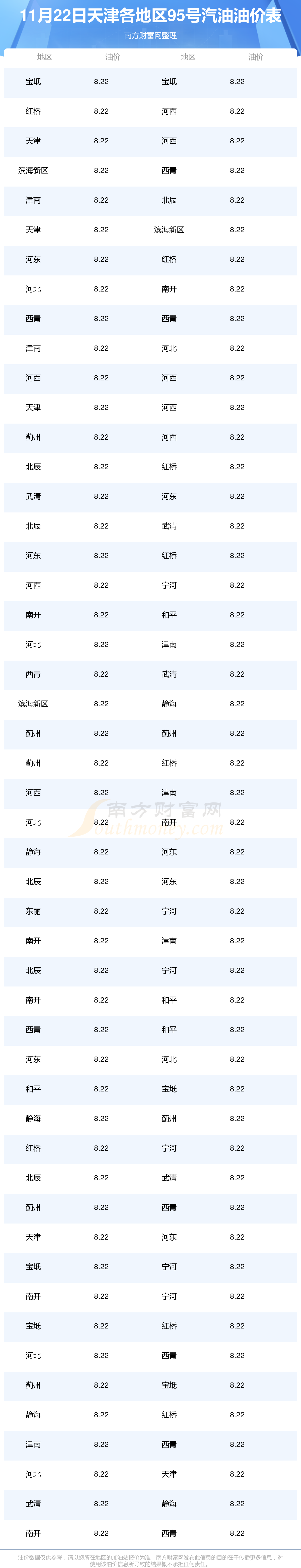 天津各地区最新95号汽油油价表