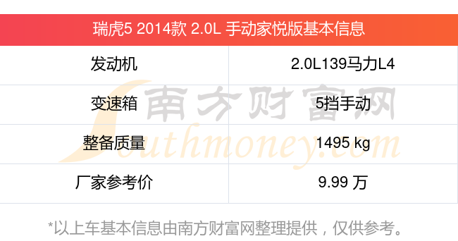 在动力上,瑞虎5 2014款 2.0L 手动家悦版配备的是一台2.0L139马力L4自然吸气发动机,匹配的是5挡手动挡变速箱,燃料形式为汽油,常规整备质量1495kg,厂家参考价9.99万元。