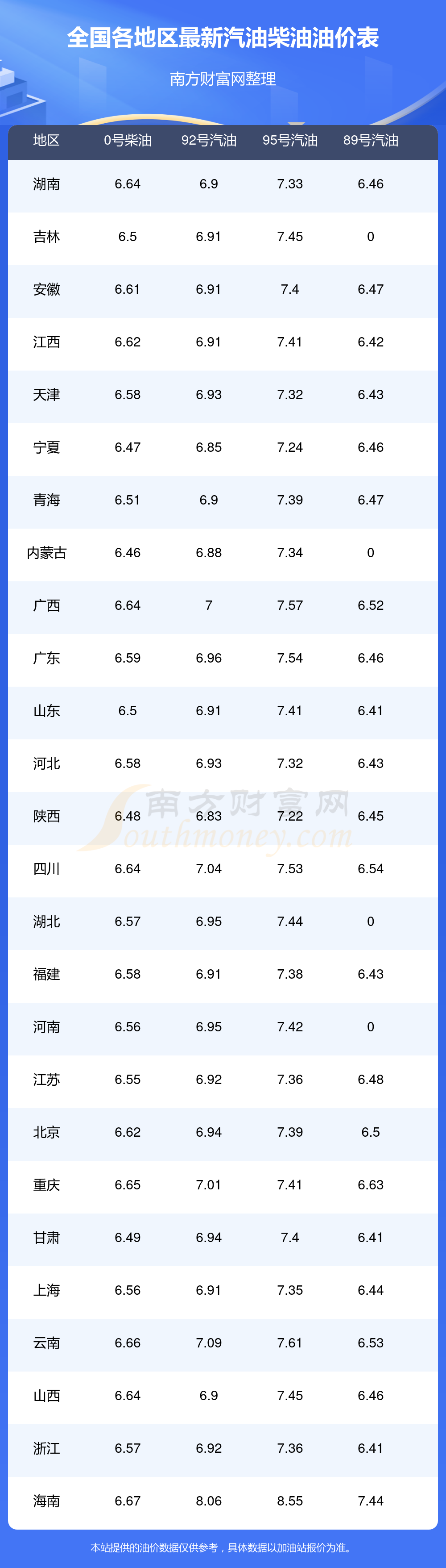 以上油价信息是当前市场上最新油价信息,油价数据仅供参考,实际在售油价可能有小幅偏差,请以您所在地区的加油站实际售价为准。