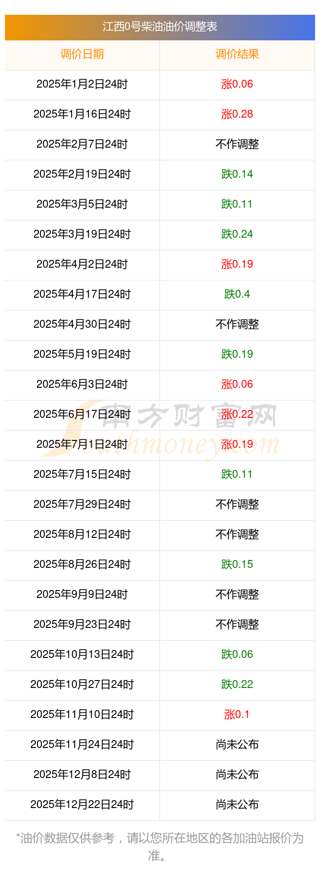 11月22日,南昌汽油、柴油每升最新价格:本轮的油价调整时间是11月11日,92号汽油为6.91元,上调了0.1元,上调幅达1.47%;95号汽油为7.41元,上调了0.1元,上调幅达1.37%;89号汽油为6.42元,上调了0.09元,上调幅达1.42%;0号柴油为6.62元,上调了0.1元,上调幅达1.53%。南昌下一轮油价调整时间11月24日24时,距离现在还有2.5天。