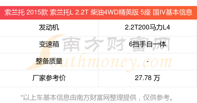 在动力方面,索兰托 2015款 索兰托L 2.2T 柴油4WD精英版 5座 国IV搭载的是一台2.2T200马力L4涡轮增压发动机,匹配6挡手自一体自动档变速箱,燃料形式为柴油,厂家参考价27.78万元。