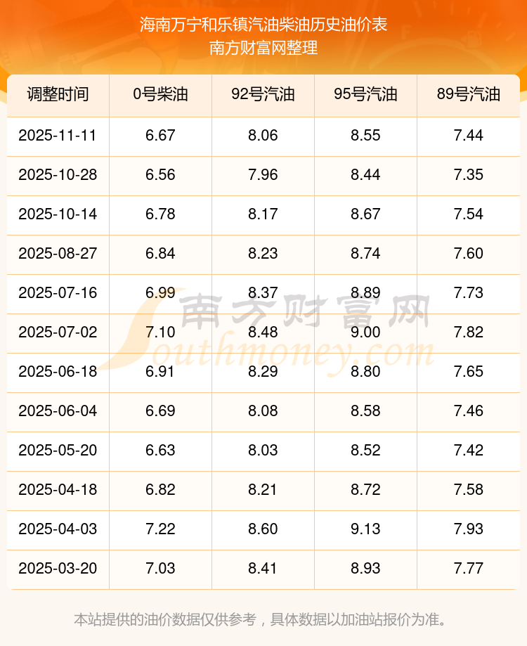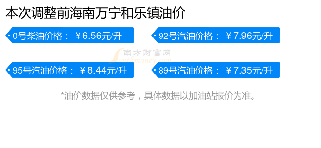海南万宁和乐镇汽油、柴油11月22日每升最新价格为:0号柴油为6.67元,升了0.11元;95号汽油为8.55元;92号汽油为8.06元;89号汽油为7.44元,调整时间为11月11日。