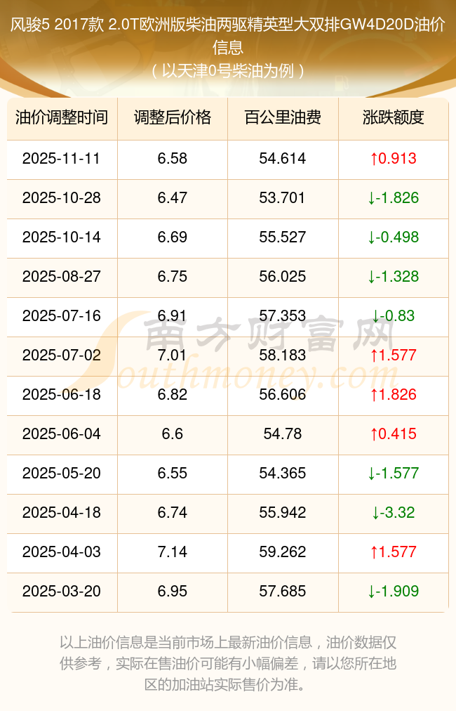 按11月11日0号柴油最新调整价格6.58元每升来计算(以天津为例),该车型百公里平均油费为54.614元,按上一轮10月28日调整价格6.47元每升来计算,百公里平均油费为53.701元,对比上一轮多花0.913元,下一轮油价调整时间为11月24日24时。