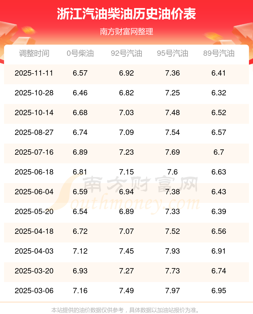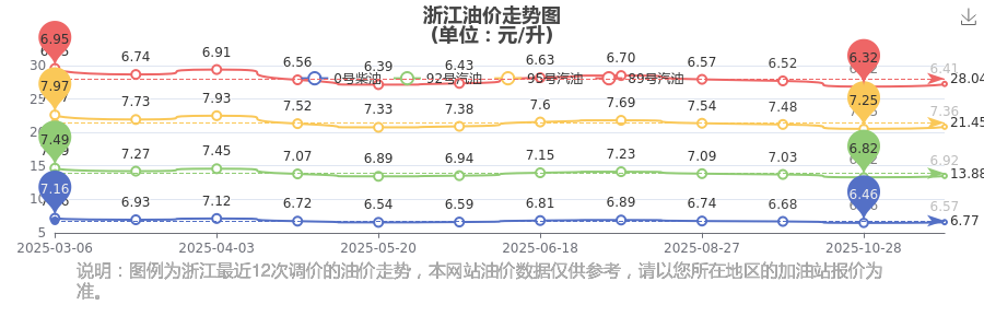 11月22日浙江汽油、柴油的最新价格是11月11日调整后的价格,具体为92号汽油6.92元,上涨了0.1元,上涨幅达1.47%;95号汽油7.36元,上涨了0.11元,上涨幅达1.52%;89号汽油6.41元,上涨了0.09元,上涨幅达1.42%;0号柴油6.57元,上涨了0.11元,上涨幅达1.7%。