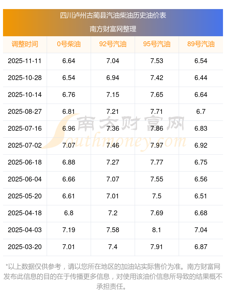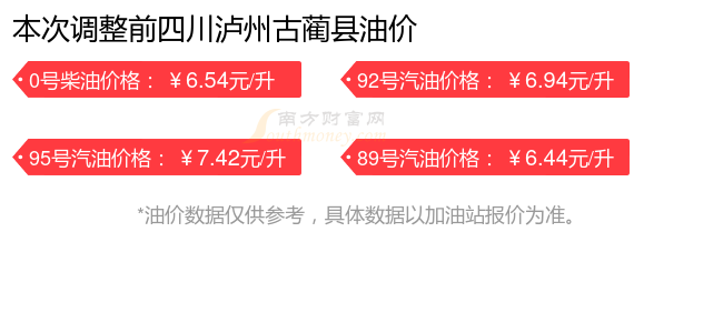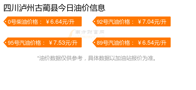 11月22日,四川泸州古蔺县汽油、柴油每升最新价格为:92号汽油为7.04元,上涨了0.1元;95号汽油为7.53元,上涨了0.11元;89号汽油为6.54元,上涨了0.1元;0号柴油为6.64元,上涨了0.1元,调整时间为11月11日。