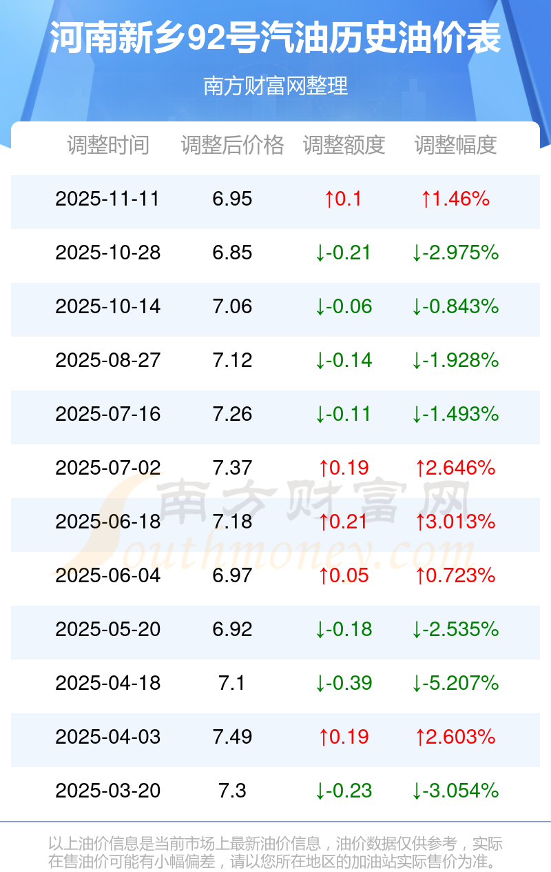11月22日河南新乡92号汽油的价格为11月11日调整后的价格,具体为:6.95元每升,相对上次调整时间10月28日的油价6.85元每升,上升了0.1元,上升幅达1.46%。下一轮油价调整时间11月24日24时,距离现在还有2.48天。