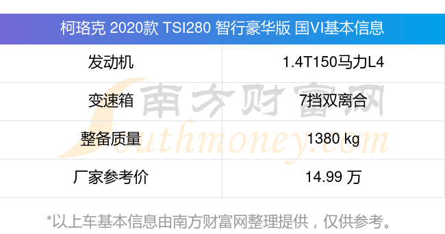 在动力上,柯珞克 2020款 TSI280 智行豪华版 国VI配备的是一台1.4T150马力L4涡轮增压发动机,匹配的是7挡双离合自动档变速箱,燃料形式为汽油,常规整备质量1380kg,厂家参考价14.99万元。