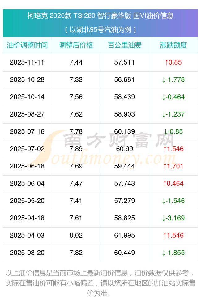 按照11月11日95号汽油最新调整价格7.44元/升来计算(以湖北为例),该车型百公里平均油费为57.511元,按照上一轮10月28日调整价格7.33元/升来计算,百公里平均油费为56.661元,对比上一轮多花0.85元,下一轮油价调整时间为11月24日24时。