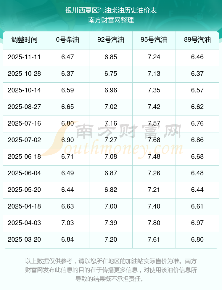 油价调整最新消息:下一轮油价调整时间11月24日24时。11月22日银川西夏区汽油、柴油每升的价格为:92号汽油为6.85元,升了0.1元;95号汽油为7.24元,升了0.11元;89号汽油为6.46元,升了0.09元;0号柴油为6.47元,升了0.1元,本轮油价的调整时间为11月11日。