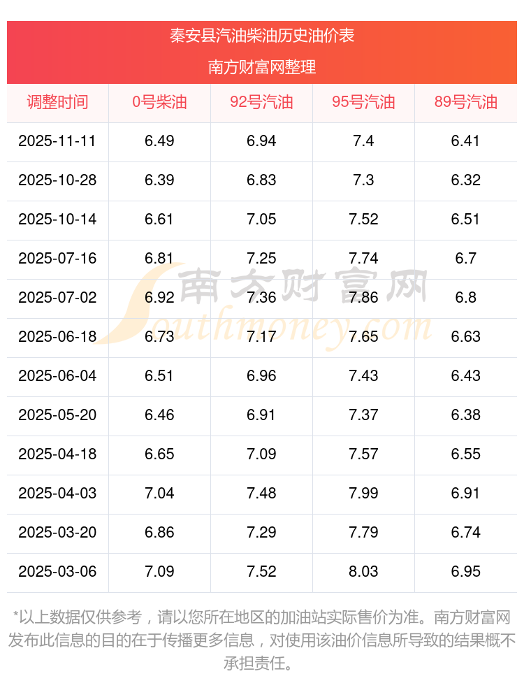 油价调整最新消息:下一轮油价调整时间11月24日24时。11月22日秦安县今日汽油价格如下:92号汽油6.94元;95号汽油7.4元;89号汽油6.41元;0号柴油6.49元(该价格为11月11日调整后的价格)。