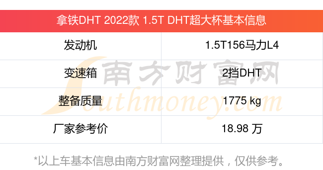 拿铁DHT 2022款 1.5T DHT超大杯动力上配备的是一台1.5T156马力L4涡轮增压发动机,匹配的是2挡DHT自动档变速箱,燃料形式为油电混合,常规整备质量1775kg,厂家参考价18.98万元。